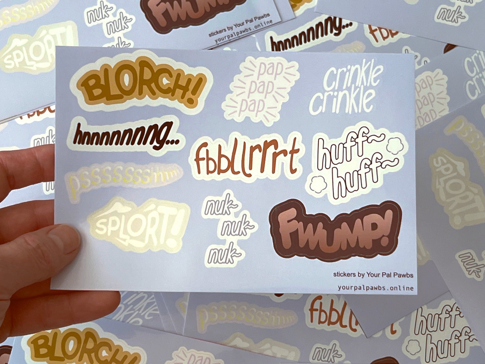 Each sheet is individually printed with dye-based inks on waterproof vinyl. Each sheet is about 5 by 8 inches in size and contains 10 kiss-cut stickers for you to peel at your leisure.